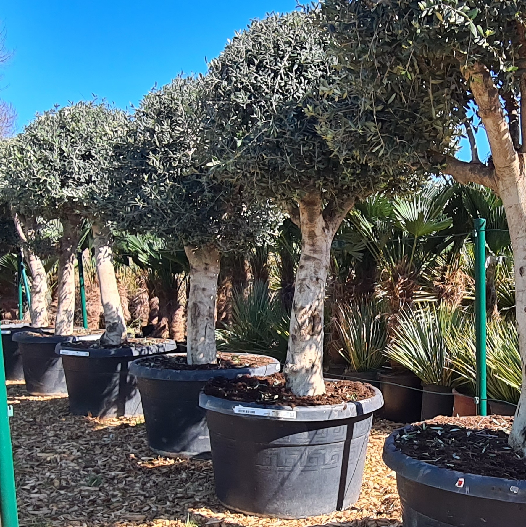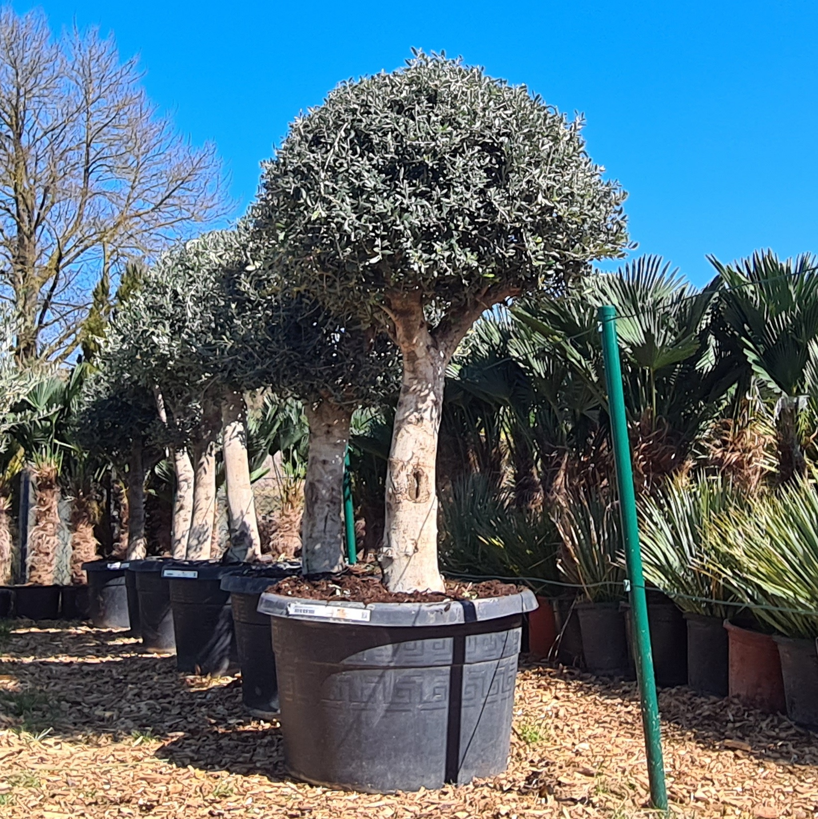 Olivenbäume Olea europaea der Sorte Arbequina mit der Schnittform Champignon und einem Stammumfang von 50-60 cm sowie einer Gesamthöhe von 160-180 cm.