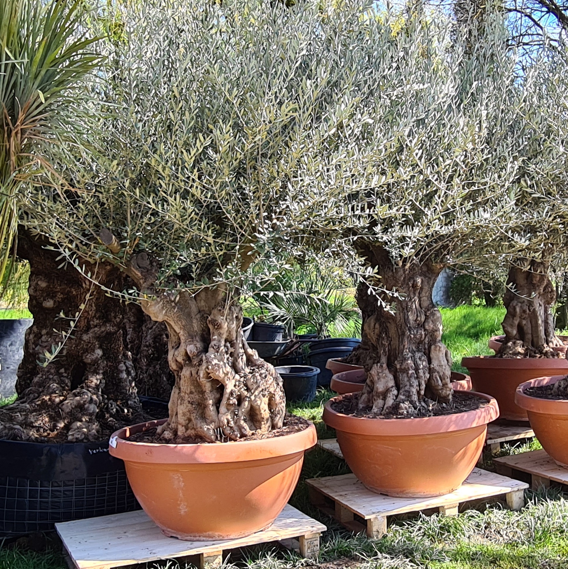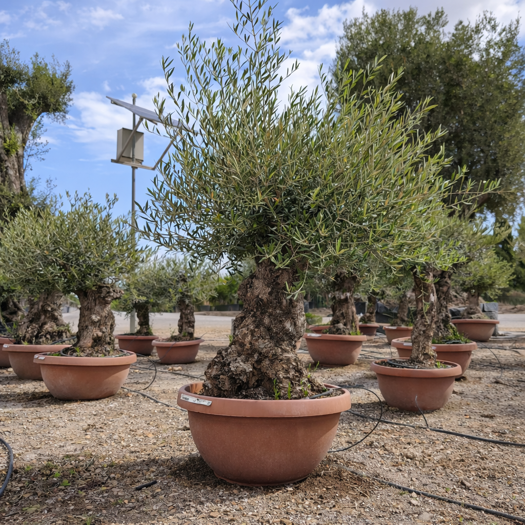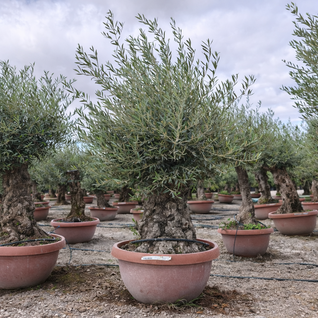 Olivenbäume mit 80-100 cm Stammumfang und einer Gesamthöhe von 200-220 cm in der Deko-Schale.