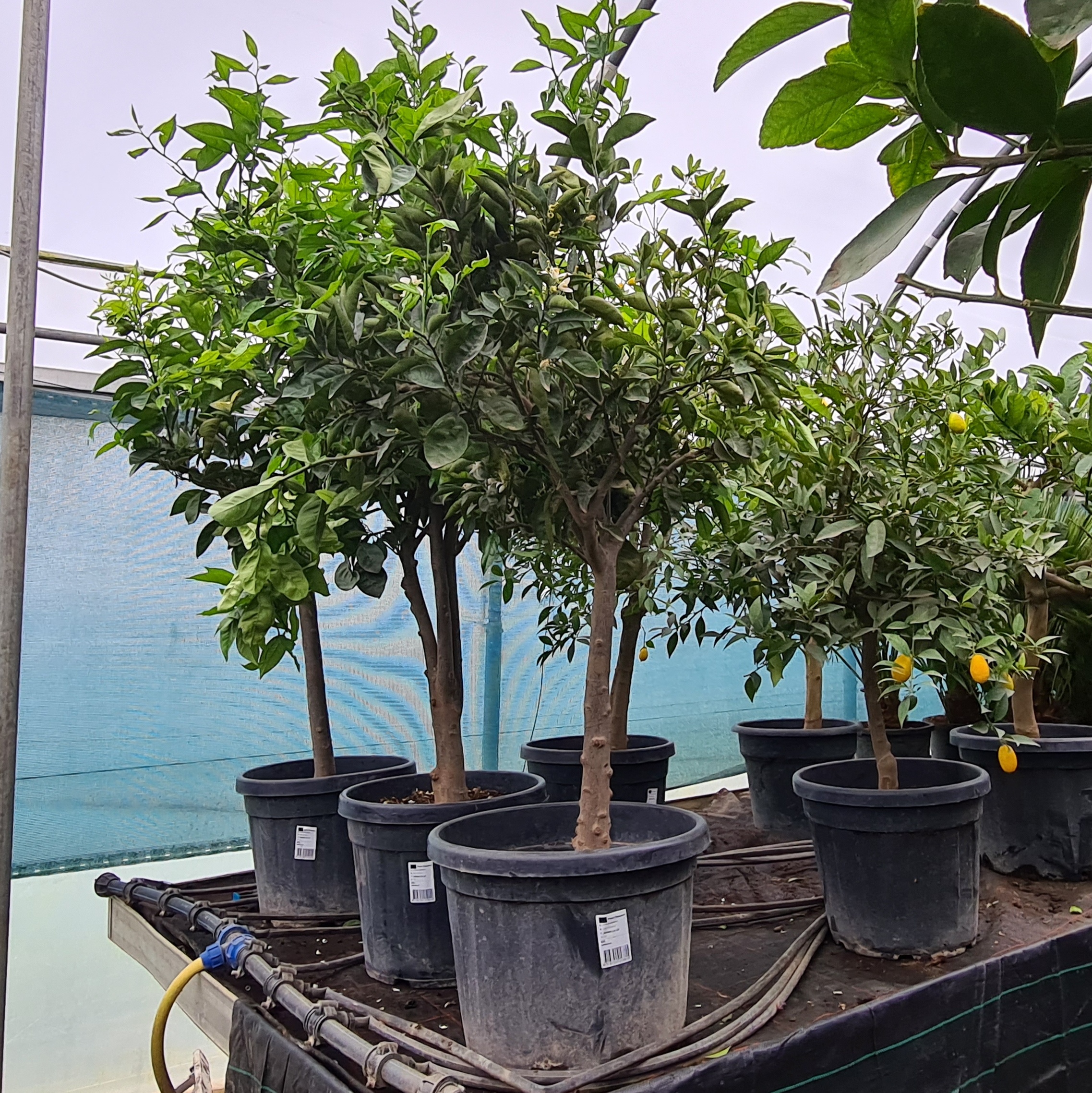 Orangenbäume Citrus sinensis Sorte Valencia Delta mit einem Stammumfang von 15-20 cm und einer Gesamthöhe von 140-150 cm.